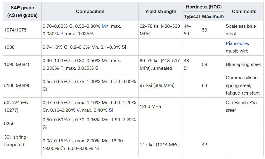 Many grades of steel can be hardened and tempered to suit application as a spring; however, some steels exhibit more desirable characteristics for spring applications.